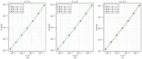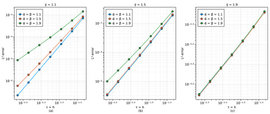 In the experiments, several combinations of the fractional derivative orders, , and , from the set were considered, and the values of and were assumed to be equal for simplicity. The calculation results are shown in Table 1 and Table 2, respectively. In the ”Order“ column, the theoretical convergence orders are indicated in parentheses. Corresponding errors plot are depicted in Figure 1 and Figure 2.