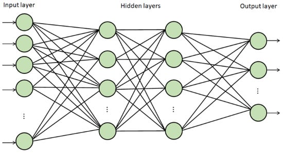 Human beings have many abilities that stand out from other living beings. Among these skills, we have the ability to learn and recognize. These tasks are performed by the human brain, which recognizes and learns complex problems. These processes can be defined as follows: Information is collected using the human senses (for example, sight), and this information is sent to previously trained neurons. The neurons react to the information providing activations. The next step consists of recognizing shapes, for example, letters or numbers [26,27]. These processes described are mimicked by a technique used in artificial intelligence called artificial neural networks (ANNs). This technique is based on the biological neural networks which compose the human brain trying to make a decision as a human would. To mimic the human brain, ANNs are mainly composed of layers: input, hidden, and output layers, with interconnected units called neurons. The ANNs can simulate complex problems by adjusting parameters as the weights, which during the learning process, store knowledge [28,29,30]. In Figure 1, the illustration of an ANN is presented where the propagation of the information up to the last layer is performed, because the neurons of each layer (input or hidden) are fully connected to the neurons of the next layer [31,32].