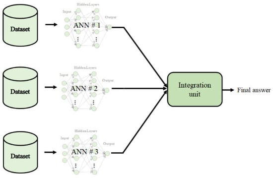 An improvement to an individual ANN is to create an ensemble neural network. Ensemble neural networks (ENNs) are composed of several artificial neural networks that learn the same information, creating individual experts in the same task. Each neural network provides results that can be different from each other [17]. A final result is achieved with the answers provided by the neural networks by combining them using an integration technique. In this work, this kind of ANN is applied to obtain an individual prediction, which is then combined with a unit integration to achieve a final prediction [16,18]. In Figure 2, an example of an ENN with three neural networks (modules) is shown.