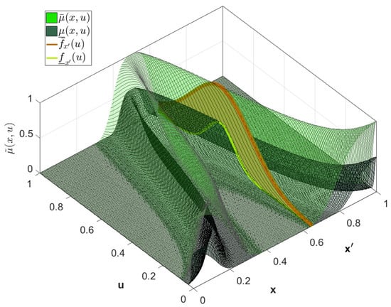 where . If , then . Then, and are the UMF and LMF of the vertical cuts with the IT2 FS of the secondary IT2 MF of the IT3 FS [41]. A visualization of this IT3 MF is shown in Figure 4.