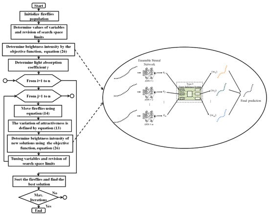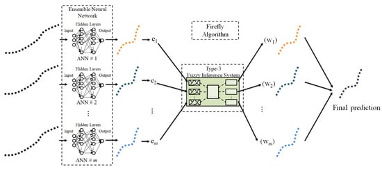 The proposed method designs ENNs for a time series prediction, where each individual neural network provides a prediction for the testing set and 20 future days. The set of predictions is combined using a type-3 FIS to establish a weight for each prediction, and thus, obtain a final prediction. An FA is applied to design the architecture and parameters of the ENNs and the FIS. The proposed ENNT3FL-FA is shown in Figure 5. The design of each ENN consists of mainly finding the number of modules (ANNs); this task is developed by the FA, which can search from 1 to “m” modules, and each prediction is combined using a type-3 FIS. The firefly algorithm also optimizes the type-3 fuzzy inference system.