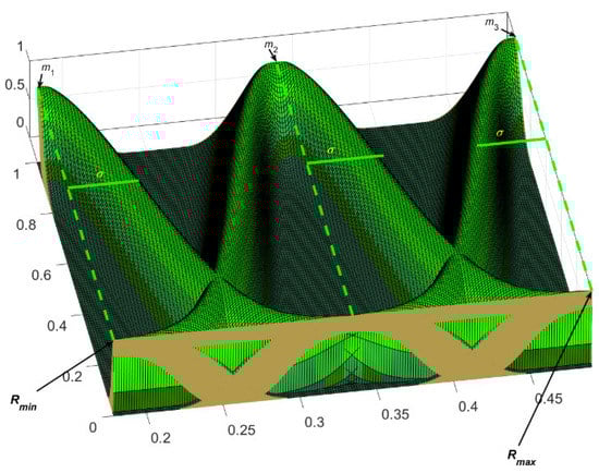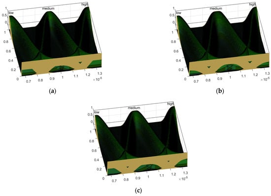 An example of a type-3 fuzzy input variable is shown in Figure 7. As previously mentioned, a Gaussian type-3 membership function has four values: sigma (), mean (), lower scale (), and lower lag (). The difference between and must be calculated by Equation (19) to determine the sigma and mean values. The sigma value and means of the three membership functions are given by Equations (20)–(23). The constant values of the fuzzy output variables are established by the FA.
