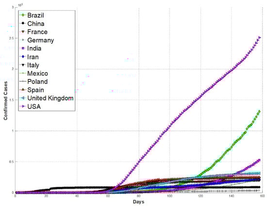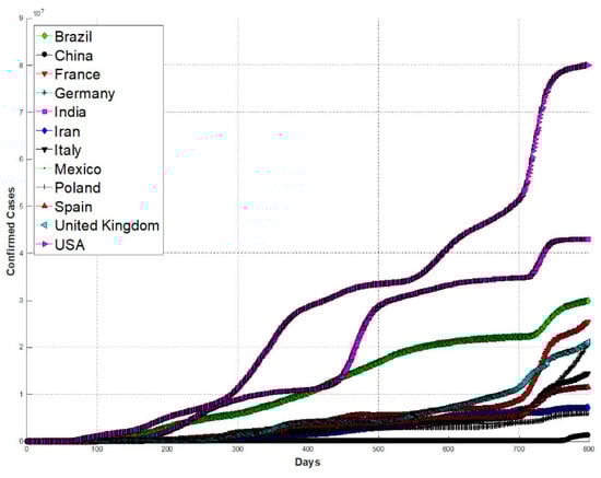 The information of the worldwide confirmed cases dataset is from the Humanitarian Data Exchange [51]. In this work, two data periods are used to test the performance of the proposed method. Each one is divided into three parts: the testing, training, and validation set. The first data period is from 22 January 2020 to 29 March 2022, and this period consists of 798 days. The second data period consists of 158 days, from 22 January 2020 to 27 June 2020; the results achieved with this second data period are compared with a previous work [22]. For both data periods, 12 countries are analyzed: Brazil, China, France, Germany, India, Iran, Mexico, Italy, Spain, Poland, the United States of America, and the United Kingdom. In Figure 9 and Figure 10, the information by country is shown for the first and second data period, respectively.
