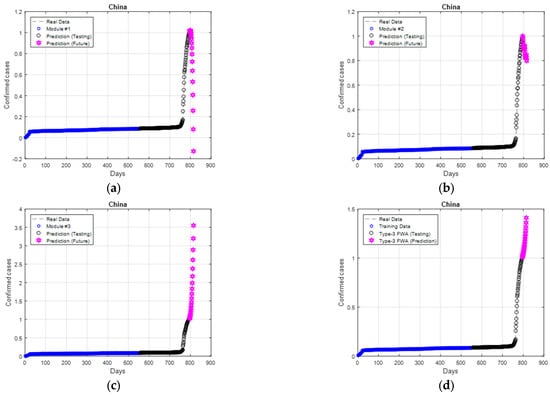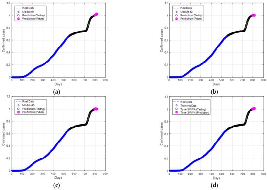 Individual behavior and final prediction for Brazil: (a) module #1; (b) module #2; (c) module #3; (d) final prediction.