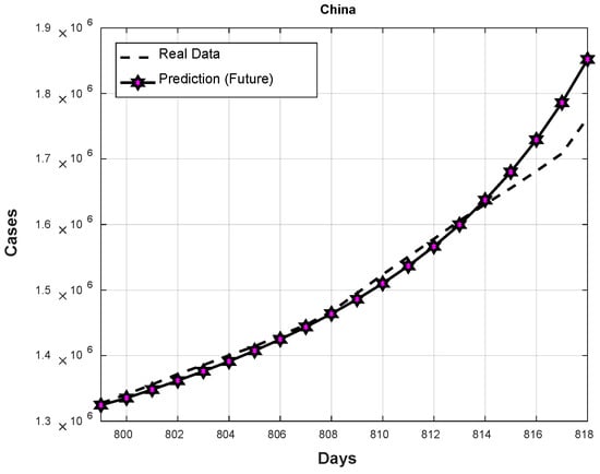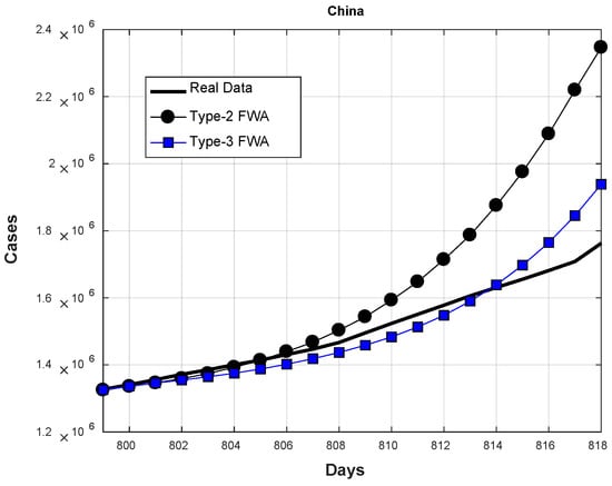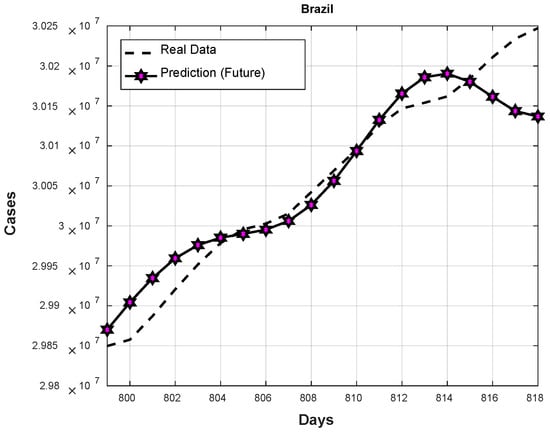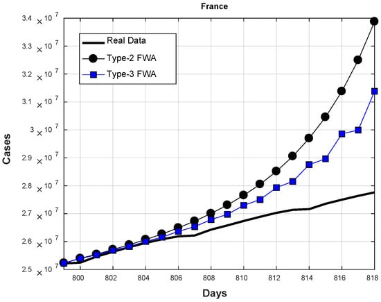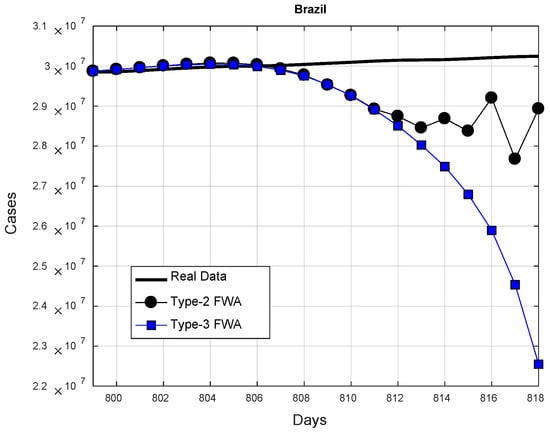In Figure 15, the average predictions of the 20 future days for Brazil are shown. As these results show, the type-2 and type-3 FWA achieved predictions closer to the real cases up to the eighth day (day #806 6 April 2022). However, after this day, the type-3 FWA integration tends to decrease more than the type-2 FWA. This behavior caused, on average, type-2 to achieve a better performance.