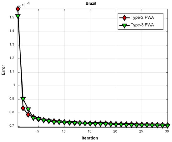 The behavior with the type-3 FWA has better convergence than the type-2 FWA technique (testing set). The results achieved with both techniques for the testing set are shown in Table 4, where a better average for Brazil is achieved using the proposed type-3 FWA (indicated in bold in the table).