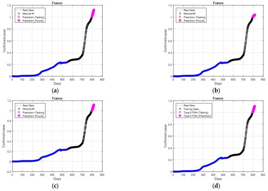 A zoom-in of the best final prediction for Brazil is shown in Figure 12, where the prediction is almost similar to the real behavior. After day #17, the prediction tends to decrease. The type-3 fuzzy input variables generated by the FA are shown in Figure 13 for module #1 (Figure 13a), module #2 (Figure 13b), and module #3 (Figure 13c).