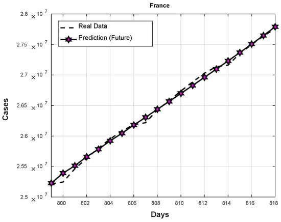 This section presents the results achieved by the proposed method applied to predicting the confirmed cases of 12 countries. The experimental results are achieved using a testing set with 30% of the information (black points on the graphs), leaving 70% to be divided into two sets: training and validation (80/20). Comparisons with a type-2 FWA presented by [22] are performed. As previously mentioned, the information of the confirmed cases of 12 countries is used, with 30 runs performed for each country. An individual prediction of the 20 future days is achieved by each module of the ENN (pink points on the graphs). These predictions are integrated using the weights provided by the FIS, and finally, a final prediction is obtained using Equation (25). This section only shows the results of three countries (Brazil, China, and France) of the first data period, but in Section 4.1 the results of the 12 countries are shown for both data periods.