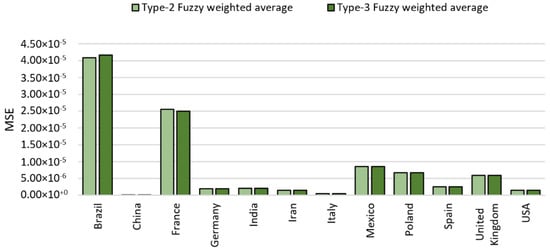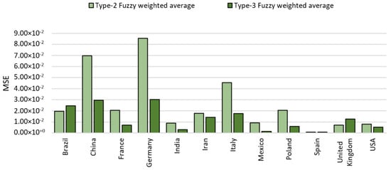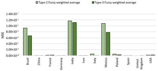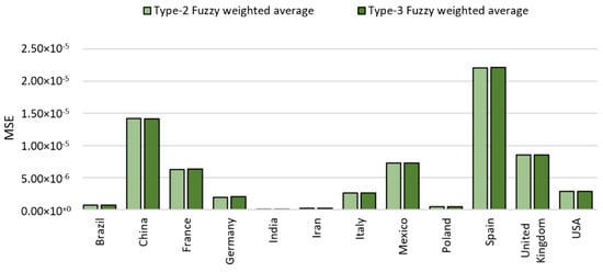 The results achieved (MSE) for the second data period are shown in Table 14 and Table 15. The results achieved with the type-2 FWA were previously presented by [22]. As the results show in Table 15, the testing set with the type-2 FWA has on average a better performance for most countries (eight countries).