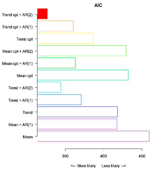 Change-point detection intends to find out the transition points that produce changes in the process of time series generation, and is extensively employed in medical, financial, meteorological, and other fields []. We employ the environmental time series change point detection (EnvCpt) method proposed by Beaulieu and Killick [] for change-point detection, a method which has proven its effectiveness in the fields of environment [], meteorology [], and tourism []. The EnvCpt method utilizes the maximum likelihood estimation to estimate the change-points, besides selecting the model with the minimum Akaike information criterion (AIC) as the best fitting model. Then, it relies on a pruned exact linear time (PELT) algorithm [] for obtaining the optimal number of change-points. Another reason for choosing the EnvCpt method in this study is its easy implementation, and the “EnvCpt” package in R can automatically apply the EnvCpt method for change-point detection with 12 different models, comprising “Trend cpt + AR(2)”, “Trend cpt + AR(1)”, “Trend cpt”, “Mean cpt + AR(2)”, “Mean cpt + AR(1)”, “Mean cpt”, “Trend + AR(2)”, “Trend + AR(1)”, “Trend”, “Mean + AR(2)”, “Mean + AR(1)”, and “Mean” []. The “Trend cpt + AR(2)” denotes the multiple change-points in the trend with the second-order autoregression, it is calculated as: