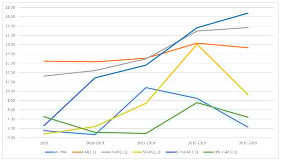 To illustrate the robustness of the proposed model in this study, we verified the prediction accuracy of the model for different test sets. We took the students studying abroad as an example for proving the robustness of the proposed CPD-FGM(1,1) model in comparison with other prediction models. The results are shown in Figure 4. The horizontal coordinates are the different test sets and the vertical coordinates are MAPE. For example, the CPD-FGM(1,1) model obtained the minimum MAPE of the ex-post testing in the test set from 2017 to 2019, while the ARIMA performed best in the test set from 2015 to 2019 (see Figure 5).