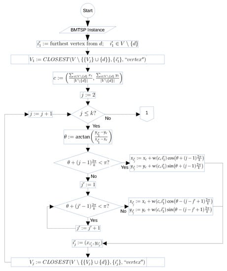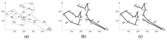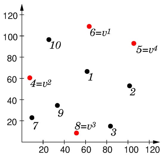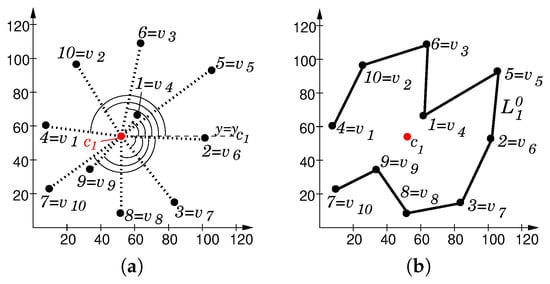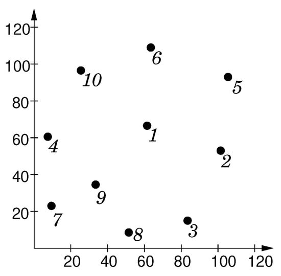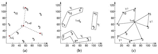 Figure 12 illustrates the algorithm applied to our sample problem instance with 10 vertices. Here, we let salesmen, , and . In Figure 12a, the auxiliary point is 7. Then, the coordinates of auxiliary points and are calculated. Figure 12b represents the created partition of set with , and . In Figure 12c, tours , , and are represented.