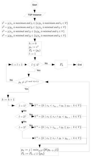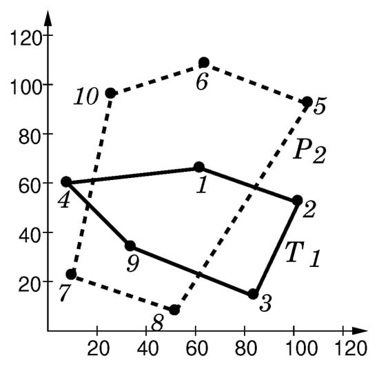 The Traveling Salesman Problem (TSP) is an NP-hard problem, as proven by Karp in 1972 [1]. It aims to construct a tour for a salesman who must visit n clients or cities, each of them exactly once, except that the first visited city is repeatedly visited at the end of the tour. The objective is to minimize the overall incurred distance. We shall rely on the following graph-theoretical formulation of the problem. We are given an undirected weighted complete graph , where the vertices from set V are identified as the clients or cities and the edges from set E represent connections between these cities, so that their weights represent the corresponding distances; i.e., for every , the weight is the distance between cities i and j. We consider the Euclidean setting of the problem, where the distances between the cities are calculated in a two-dimensional plane, the cities being represented as points in that plane. Therefore, we treat the vertices from set V as points in the two-dimensional plane and edges as vectors in that plane. In this way, we deal with a kind of projection of graph G in the two-dimensional plane. Note that the Euclidean TSP is symmetric, i.e., for any edge , .