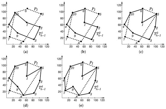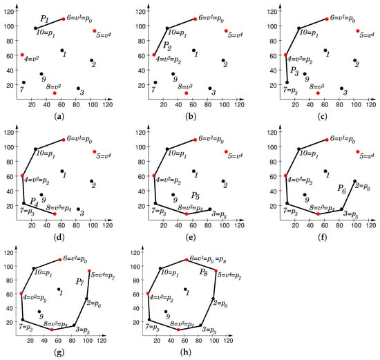 Unlike the insertion algorithm, the first polygon that the inflammation algorithm constructs is the “smallest” one that is extended to “larger” polygons at consecutive iterations (in particular, it is not a girding polygon). The polygon constructed at iteration h, , is an inner convex hull, i.e., it does not contain vertices from set V in its interval area, except that it may contain vertices in its internal area that belong to the earlier-constructed polygons (if polygon contains a vertex from set V in its internal area, then this vertex belongs to the polygon of an earlier iteration). Note that each polygon defines an optimal partial tour for the set of vertices that it contains, similarly to how the girding polygon P from Section 2.1 defines an optimal tour . As we know, if , then from Section 2.1 defines an optimal tour. Hence, in the inflammation algorithm, we assume that this condition is not satisfied.