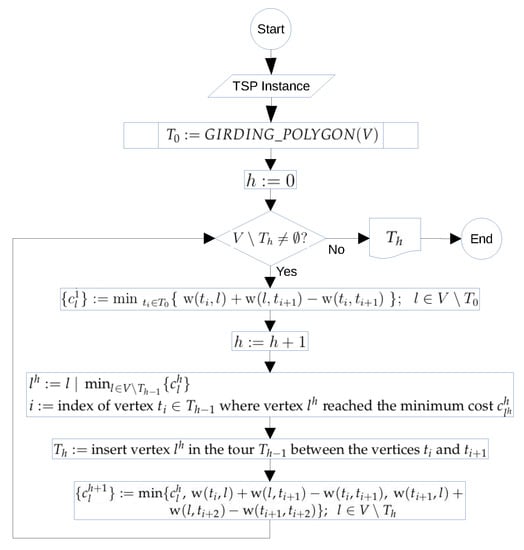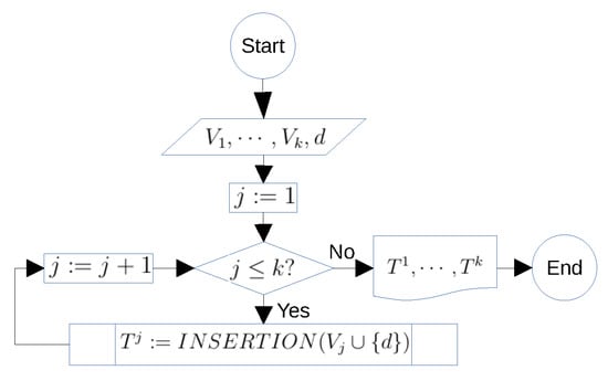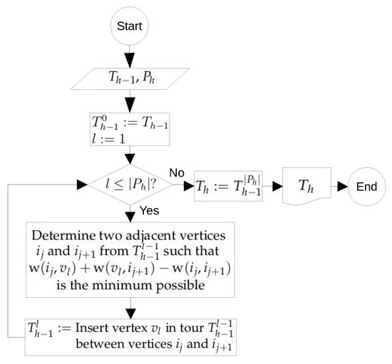 Figure 7 illustrates the three iterations of the insertion algorithm for our problem instance “tsp10” with 10 vertices. Here, . At iteration 1, the costs and are calculated, and the vertex 9 is inserted between the vertices 7 and 8 since ; see Figure 7b. At iteration 2, is (re)calculated and the vertex 1 is inserted between vertices 5 and 6; see Figure 7c. Hence, a feasible solution is delivered. The pseudo-code of the insertion algorithm and its flowchart are given below.