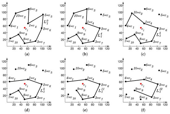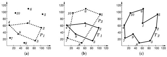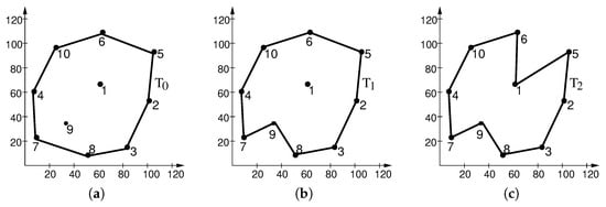 Iterations made by the insertion algorithm to solve the example instance “tsp10”. (a) The tour is delivered by (). (b) Vertex 9 is inserted between vertices 7 and 8. (c) Vertex 1 is inserted between vertices 5 and 6. The feasible tour constructed is .