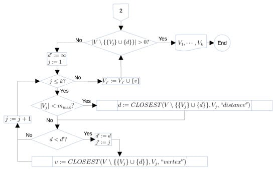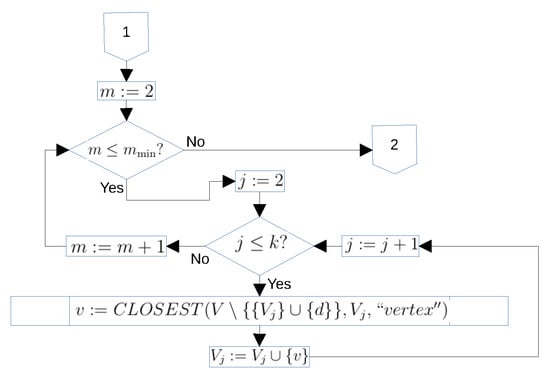Once the initial sets , are so formed, repeatedly, for each subset , a new vertex v with the minimum distance between that vertex and a vertex from the current set are added to that subset, i.e., . This operation is repeated until the current set contains elements (see Figure 9).