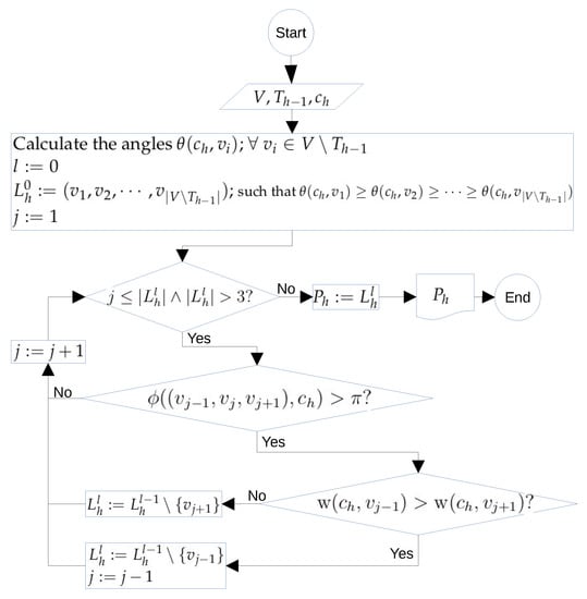 Our algorithm for the construction of the girding polygon P works in a number of iterations, being the partial polygon (polygonal line) of iteration h. Iteratively, at iteration h, one vertex, denoted by , is added to the partial polygon of iteration , i.e., (abusing again the notation, we also use for the set of vertices in polygon ).