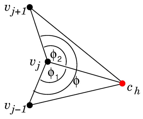 Let and , and let be the corresponding vector (edge) in 2-dimensional Euclidean space. The algorithm for the construction of polygon P uses function (Equation (4)), which returns the angle between axes and vector ; see Figure 2.