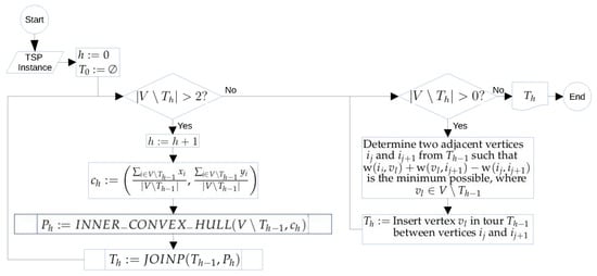 The inflammation algorithm iteratively, at every iteration h, constructs the polygon containing (some) vertices from set (see Algorithm 3), where we denote again by the partial tour constructed by iteration h. Initially, we let , and is formed by the partial tour of polygon . At iteration , Algorithm 4 () constructs partial tour by joining the vertices of polygon and the partial tour as described later in Section 2.4.2.