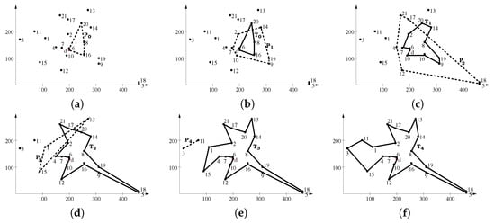 Iterations performed by the Algorithm 1 () for the construction of the girding polygon P for the example instance “tsp10”.