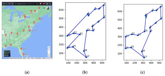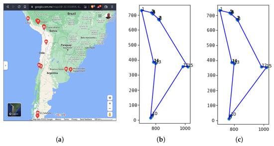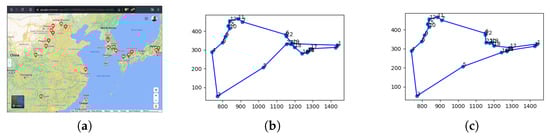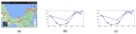 Map and solution of instance “Mexico.tsp”. (a) Map [58]; (b) Solution; (c) Improved solution.