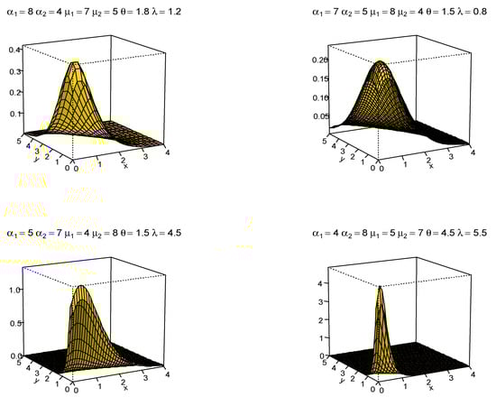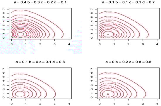 To make things easier in terms of writing and visualization, let , , and . Depending on a variety of choices for the mixing parameters and for , several shapes of the joint PDF in (5) are provided in Figure 1. Moreover, several contour plots for various values of , , and when are displayed in Figure 2. As one might expect, not all four components may be required in applications to real-world data sets. Consequently, some constraints can be applied, such as , or , as appropriate. These constraints result in correlation values of +1, −1, and 0 among the shape parameter, respectively.