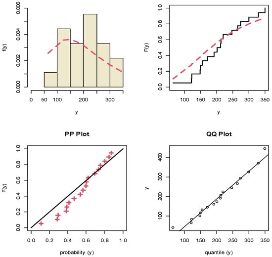 It shows that the APE distribution fits the motor data sets quite well. Moreover, some graphical methods for goodness of fit for the motor data sets are developed. Plots of fitted density, empirical cumulative distribution, probability-probability (PP) and quantile-quantile (QQ) for X and Y data sets are displayed in Figure 3 and Figure 4, respectively. It is clear that the two variables X and Y are fitted for the marginal APE distribution.