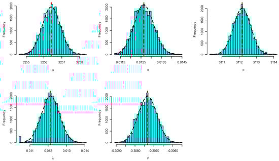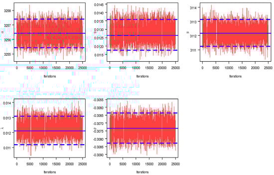 Using the complete X and Y data sets, the MLEs and 95% ACIs of , , , and are calculated. Furthermore, since no prior information is available about the MBAPE parameters, the Bayesian (point/credible) estimates of , , , and are developed using the non-informative priors. Taking the maximum likelihood estimates of the same unknown quantities as initial values, the MCMC sampler is replicated 30,000 times and then the first 5,000 iterations removed as a burn-in. The point (with their SEs) estimates and interval (with their lengths) estimates of the unknown parameters based on X and Y data sets are computed and listed in Table 8 and Table 9, respectively. This indicates that the estimates of the unknown parameters obtained by maximum likelihood and Bayesian methods are very similar. Moreover, trace plots (in Figure 5) for MCMC draws of the posterior generated samples of , , , and showed that the MCMC simulated variates converge very well. It represents the sample mean and two bounds of 95% BCIs with solid (—) and dashed (- - -) lines, respectively. Moreover, the MCMC frequency estimates of , , , and using the Gaussian kernel are represented in Figure 6. It represents the sample mean with a vertical dash-dotted (:) line. It is evident that the generated posteriors of all unknown parameters are quite symmetrical. To sum up, the numerical findings of the suggested estimation methods based on motor data provide a good demonstration of the proposed model.