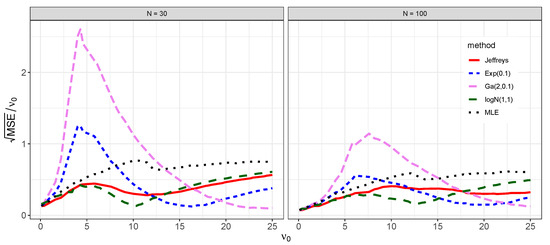 4.2. Numerical Comparison Using the Jeffreys, Exponential, Gamma, and Log-Normal Priors