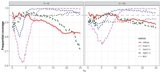 The results of the simulation are shown in Figure 5 and Figure 6. As expected, when using Bayesian and frequentist methods, the relative MSEs are smaller for than for across the values . For the Bayesian methods, the coverage properties tend to improve (that is, are closer to 0.95) for than for . In contrast, when using frequentist methods the coverage property becomes more conservative (that is, less than 0.95) for than for across the values . The Bayes estimator based on the Jeffreys prior (4) results in relatively lower MSE then the MLE over the values , in agreement with [3]. This is to some extent expected, as MLE can generally suffer in small-sample studies [51]. It is important to note that no Bayes estimator dominates other estimators over the entire interval . In other words, each Bayes estimator has its own region where the estimator is non-inferior to others.