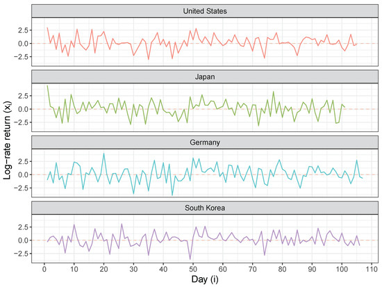 Table 2 lists the basic descriptive statistics of the index return series from the four countries. Note that the kurtosis is larger than 3 for every country, and even though the distribution of the returns does not have tails much heavier than a normal distribution it seems to be appropriate to consider a t model. Several researchers have found that Student’s t-distribution is the best marginal distribution for index returns [11,52]. Specifically, the model is , , with sample sizes (United States), 101 (Japan), 107 (Germany), and 106 (South Korea) and the goal of estimating the degrees of the freedom .