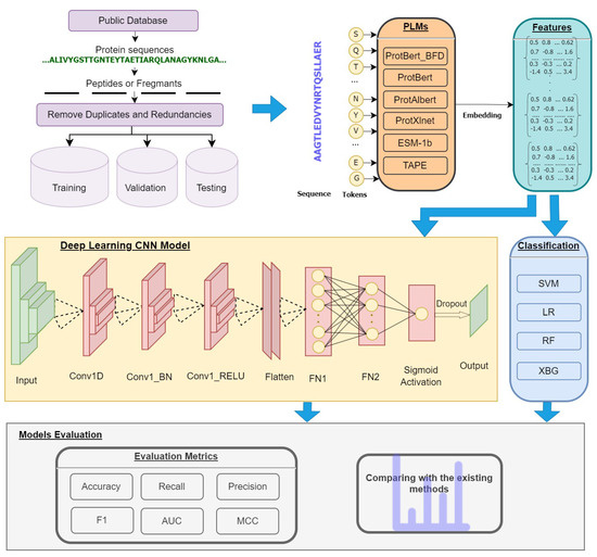 ESM-1b is a transformer PLMs from Facebook AI Research based on the BERT language model that is trained on the UniRef50 [53] database. The features are also extracted (embedding) from the last hidden state of the PLM with a size 1280 × n, where n is the length of the peptide sequence.