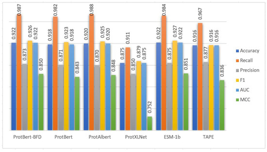 Five-fold cross-validation is also applied to the training set of Kgly dataset to evaluate the CNN model based on the embedding from the six PLMs. Table 5 and Figure 4 show the performance of the CNN model using cross-validation on the extracted features from the Kgly training set based on the six PLMs embedding. From Table 6 and Figure 4, the performance of the CNN model based on the embedding extracted from ESM-1b PLM is also better than the embeddings extracted from the other PLMs in terms of accuracy, recall, precision, F1, AUC, and MCC performance metrics. The performance of the CNN model based on all PLMs is great in general and close to each other except PTG-PLM with the ProtXLNet that gets some The model performance based on ProtXLNet PLM decreases about 5% from the ESM-1b PLM in the term of MCC measure. The five-fold cross-validation standard deviations are also consistently low based on the six PLMs (Table 6). These results demonstrated that the prediction capabilities of the models in general are stable.