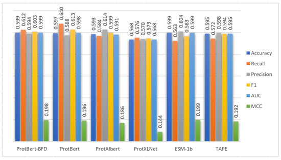 - Elnaggar, A.; Heinzinger, M.; Dallago, C.; Rihawi, G.; Wang, Y.; Jones, L.; Gibbs, T.; Feher, T.; Angerer, C.; Steinegger, M.; et al. ProtTrans: Towards cracking the language of Life’s code through self-supervised deep learning and high performance computing. arXiv 2020, arXiv:2007.06225. [Google Scholar] [CrossRef]