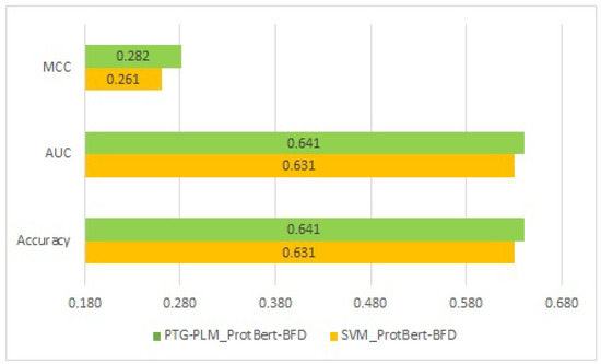 On the testing sets of Ngly and Kgly datasets, the PTG-PLM model is compared with four state-of-the-art supervised learning methods: SVM, LR, RF, and XGB based on the embedding extracted for the six PLMs. Table 7 illustrates the performance of PTG-PLM compared with supervised learning methods based on embedding extracted from the six PLMs on the Ngly independent dataset. The comparison is measured by three performance metrics: accuracy, AUC, and MCC. Generally, the PTG-PLM outperforms the other supervised learning methods in terms of accuracy, AUC, and MCC. Moreover, Table 7 shows that the highest performance of PTG-PLM on the independent dataset is based on the embedding of the ESM-1b transformer with a 0.965 accuracy, 0.978 AUC, and 0.902 MCC. On the other hand, the highest performance between the four supervised learning methods is with the XGB model and based on the embedding of ProtBert-BFD transformer with a 0.952 accuracy, 0.970 AUC, and 0.871 MCC. The comparison of performance between the best PTG-PLM model based on ESM-1b and the best-supervised learning model (XGB) based on ProtBert-BFD is shown in Figure 5.