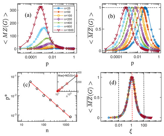 In Figure 1b, we find that the curve shift to the left on the p−axis when the order is increasing. This has to make us think that there is a scaling parameter associated with the order n that affects the curve. In order to find this scaling parameter, we choose the value of p when under the ER random graphs of different orders n, and then mark it as , as shown by the dashed line in Figure 1b.