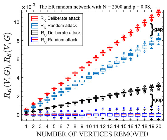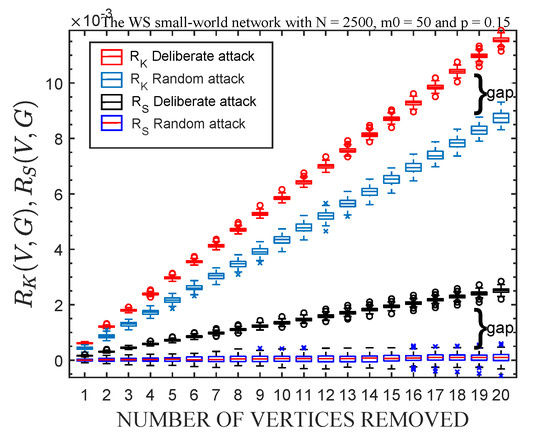 On the other hand, using as the measure, when the ER random network encounters deliberate attacks and random attacks, the distribution of the box plot shifts upwards with the number of removed vertices, but the upward trend of deliberate attacks is faster than that of random attacks. Although and have different trends in the results, we find that under deliberate attacks and random attacks, the gaps in their box plot distribution are very similar, that is, we rotate the box plot of after a certain angle, and it is highly coincident with the box plot of . In addition, when is used as the measure, the maximum gap distance of the median of the box plot is around , and when is used as the measure, the maximum gap distance of the median of the box plot is also around . Here, the maximum gap distance refers to the value of (or ) when 20 vertices have been removed from the network.