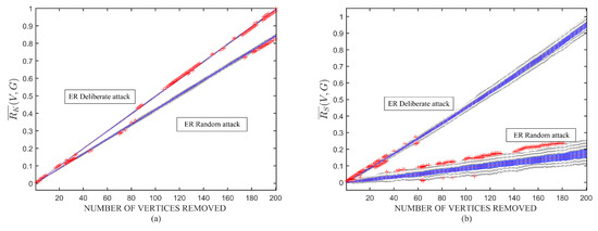 Experimental results for both measures when the number of removed vertices on the ER network reaches 200. Both are normalized data. (a) Deliberate and random attacks under the use of measures. (b) Deliberate and random attacks under the use of measures.