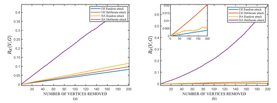 In Figure 4, we present the experimental results for both measures when the number of vertices removed on the ER network reaches 200, where the data are normalized. In Figure 4b, slowly increases as the number of vertices removed increases when subjected to random attacks. In Figure 5, we present the experimental results for both measures when the number of vertices removed on the ER network and the BA network reaches 200, where the data are averaged for better observation. In Figure 5b, using the measure, the average value of the ER random network when subjected to deliberate attacks is much lower compared to the value of the BA network when subjected to deliberate attacks, and then compared with the value of the ER random network when subjected to random attacks, it can be demonstrated that the impact of the ER random network when subjected to deliberate and random attacks does not differ much. Similarly, in Figure 5a and Figure 4a, using the measure, it can be observed that the impact of the ER random network when subjected to a deliberate attack does not differ much from that of a random attack.