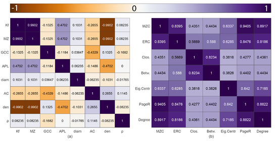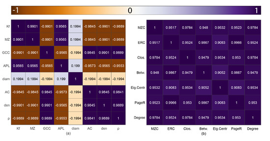 First, we calculate the correlation between the eight global measures in Erdös−Rényi random graphs with 2500 vertices and probability , as shown in Figure 7a. We generate over different Erdös−Rényi random graphs, and then perform Kendall Tau correlation analysis. Moreover, we also calculate the correlation between the seven local measures, as shown in Figure 7b.