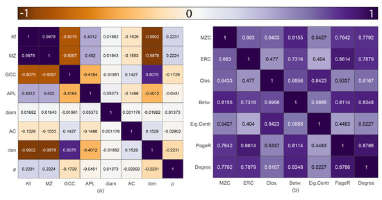 (a) The correlation between the global graph measures for more than graphs generated by the Barabási−Albert scale−free model with and . (b) The correlation between the local measures of each vertex of the graph generated by the Barabási−Albert scale−free model with , and .