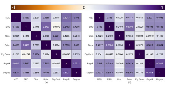 Comparing Modified Zagreb index centrality with other different local measures, Figure 11 shows the different results of these measures and Figure 12a shows the correlation between these measures. As reported in Table 2, we observe that these local measures rank the important vertices of the European Road network in different ways. The ∞ in the effective resistance centrality ranking is because this vertex is a cut vertex. It is worth noting that the vertex evaluated by Modified Zagreb index centrality as the most important is also selected by the betweenness centrality (ranking 2nd), Page Rank centrality (ranking 1st), and degree (ranking 1st). This means that the road section represented by the most important vertex measured by the Modified Zagreb index centrality is the necessary place for almost all important transportation in the European road network. Therefore, it is easy to understand that this vertex is vital to the network, and its failure or destruction will seriously affect the robustness and structure of the network, which shows the efficiency of the Modified Zagreb index centrality again.