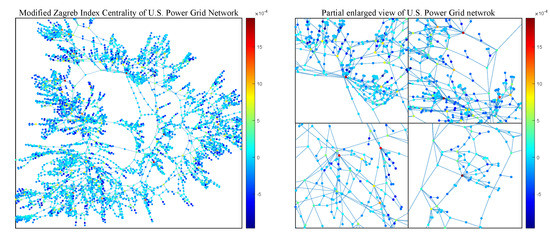 Then, we perform the same analysis on the U.S. Power Grid network, as shown in Figure 13. In Figure 12b, we show the local measures correlation in the U.S. Power Grid network. The numerical results are slightly different from those of the European road network, but overall, effective resistance centrality, betweenness centrality and Page Rank centrality are correlated with the Modified Zagreb index centrality. We visualize the Modified Zagreb Index centrality for the U.S. Power Grid network, as shown in Figure 13, with a global view on the left and a magnified view of some important vertices on the right.