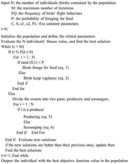 - According to their activity, the birds, will perform the following functions: Producers actively search for food, and Scroungers randomly follow a producer to search for food. Figure 1 presents the pseudo-code that corresponds to BSA.