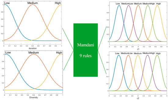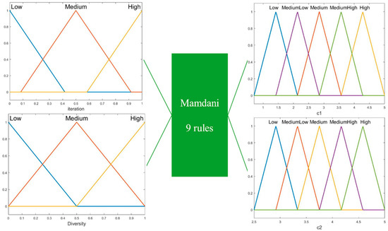 The proposed fuzzy system to perform the dynamic parameter adaptation corresponds to the Mamdani type. This has two inputs designed with triangular membership functions corresponding to iterations and diversity. Each input has three membership functions and uses as linguistic variables the following terms: “low”, “medium”, and “high”. The outputs correspond to C1 and C2 variables, which have five membership functions, and use “Low”, “MediumLow”, “Medium”, “MediumHigh”, and “High” as linguistic values, and this proposal is presented in Figure 3.