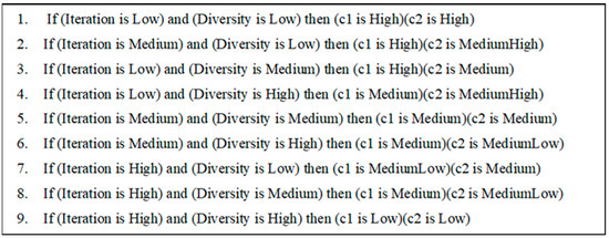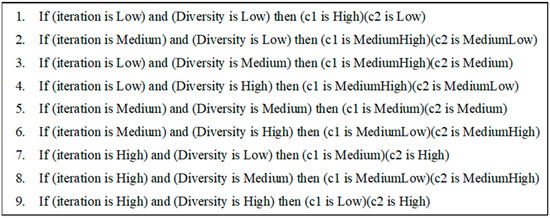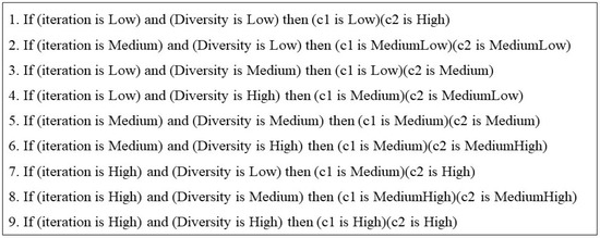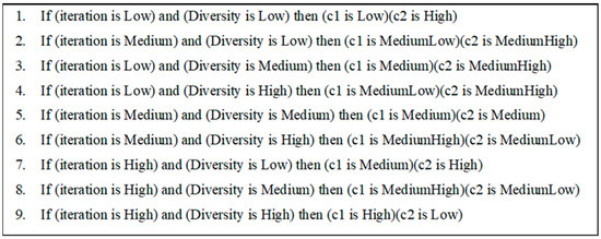 Figure 6 presents the fuzzy rules set corresponding to C1, which maintains medium–low iterations, and C2 maintains medium–high iterations.
