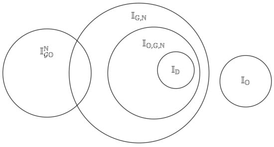 In Figure 1, we illustrate the main results presented in this section. Note that the intersections between the families of , , and D-implication functions had already been presented in other works [32,33,34,35].