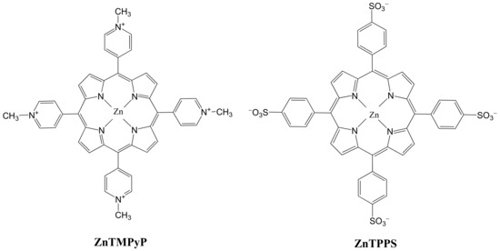 Structures of zinc(II) meso-tetrakis methylpyridiniumyl (ZnTMPyP) and zinc(II) meso-tetrakis sulfonatophenyl (ZnTPPS) [35,36].