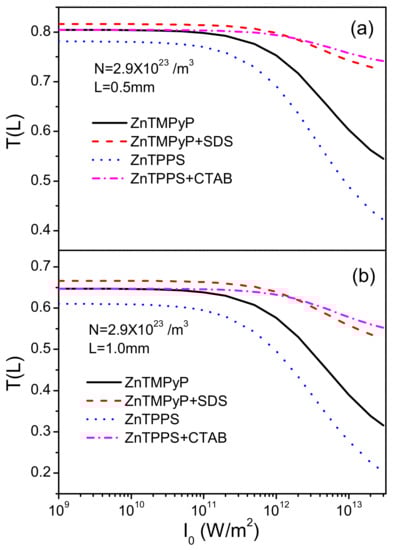 Energy transmittance (Equation (6)) as a function of the peak intensity of incident laser at (a) L = 0.5 mm and (b) L = 1.0 mm for ZnTMPyP and ZnTPPS in aqueous solutions and their porphyrin J-aggregates with micelles of SDS and CTAB. /m.